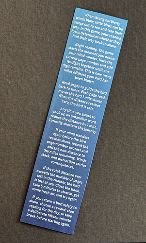 When strong northerly winds blow, little birds can be blown out to sea. In this game, each wandering thought sends a bird farther from shore, and steady reading is what guides it back. Using only your book, its page numbers, and your attention, you’ll track how far a bird has drifted and bring it home one page at a time.